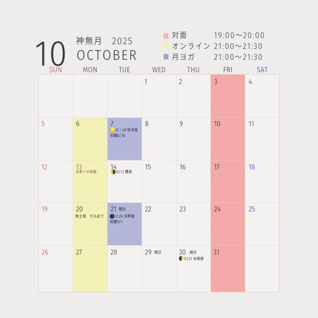2025.09.30 LESSON SCHEDULE 10月レッスンスケジュール 8・9・10月【秋のデトックスヨガ】レッスンスケジュールの変更やまたは中止になる場合がございます。予めご了承ください。 【ヨガ】 【イベント】 SHARE! BLOG TOP
