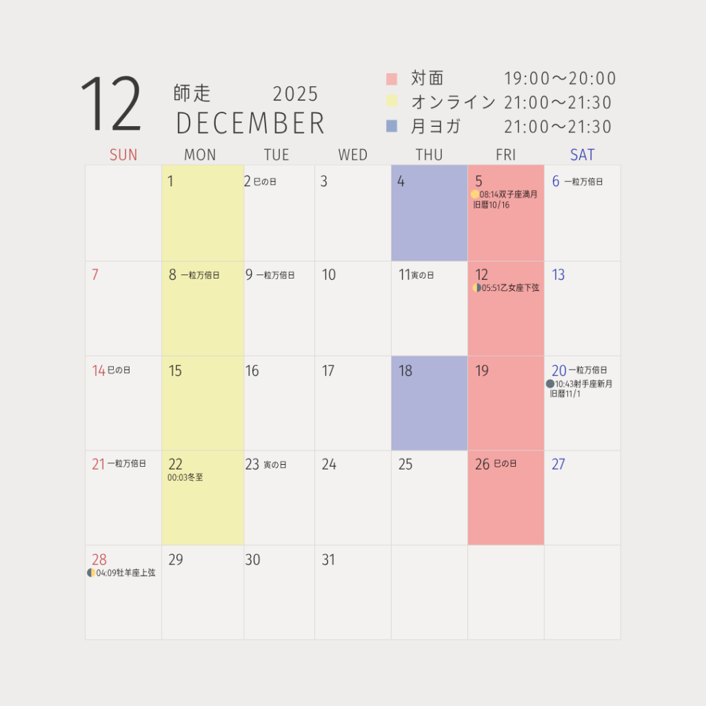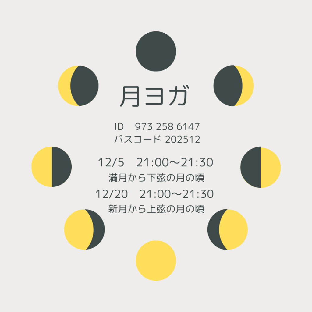 2025.11.01 LESSON SCHEDULE 12月レッスンスケジュール 11・12・1月【冬の痩身ヨガ】レッスンスケジュールの変更やまたは中止になる場合がございます。予めご了承ください。 【ヨガ】 【イベント】 SHARE! BLOG TOP
